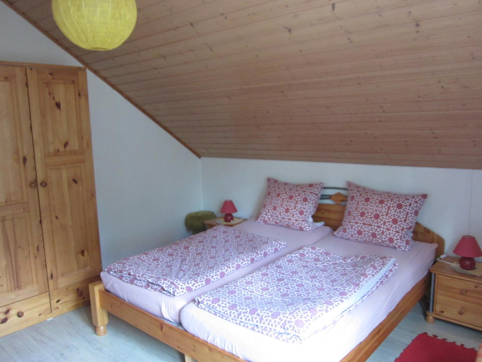 Doppelbett, 2 Nachttische mit Lampen, Kleiderschrank, 2 Stühle, Bettwäsche, bei Bedarf Kinderbett